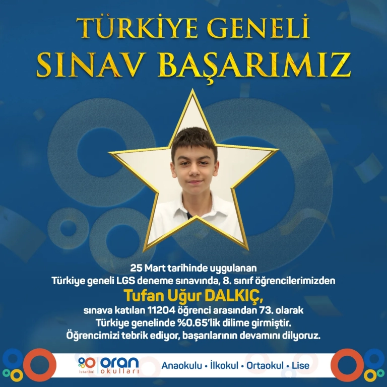 25 Mart tarihinde uygulanan Türkiye geneli LGS deneme sınavında, 8. sınıf öğrencilerimizden Tufan Uğur DALKIÇ, sınava katılan 11204 öğrenci arasından 73. olarak Türkiye genelinde %0.65’lik dilime girmiştir. Öğrencimizi tebrik ediyor, başarılarının devamını dilyoruz.