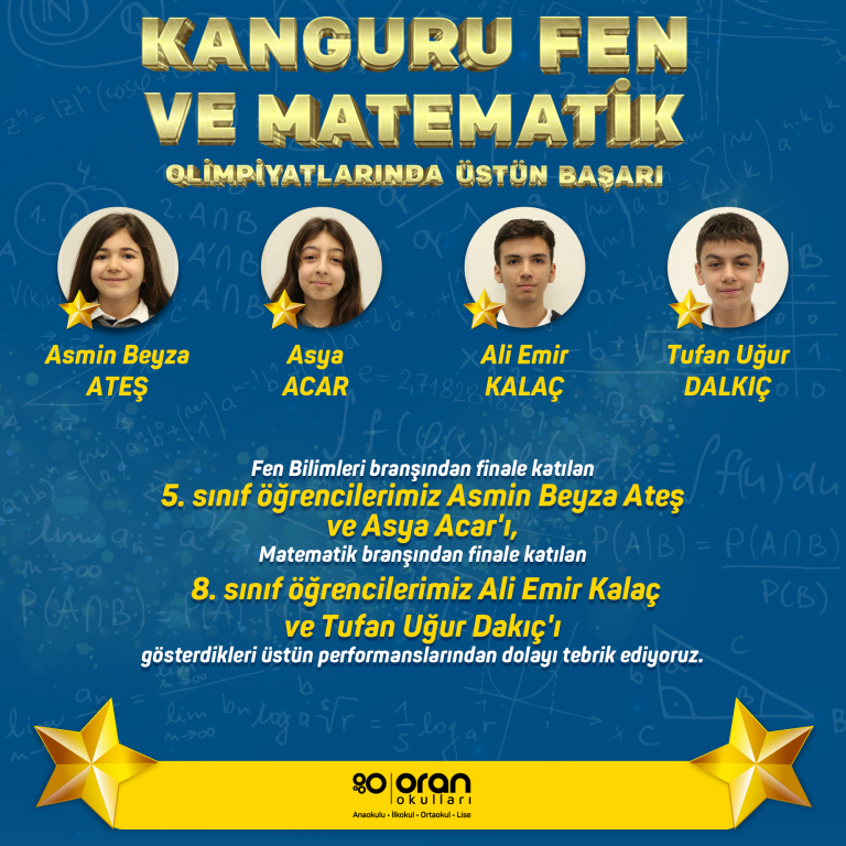 Fen Bilimleri branşından finale katılan 5. sınıf öğrencilerimiz Asmin Beyza Ateş ve Asya Acar'ı, Matematik branşından finale katılan 8. sınıf öğrencilerimiz Ali Emir Kalaç ve Tufan Uğur Dakıç'ı gösterdikleri üstün performanslarından dolayı tebrik ediyoruz