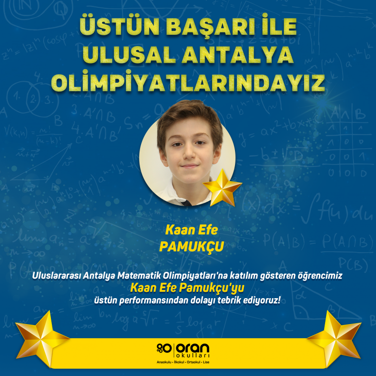 Uluslararası Antalya Matematik Olimpiyatları'na katılım gösteren öğrencimiz Kaan Efe Pamukçu'yu üstün performansından dolayı tebrik ediyoruz!