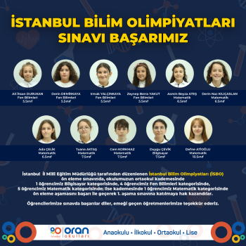 İstanbul İl Milli Eğitim Müdürlüğü tarafından düzenlenen İstanbul Bilim Olimpiyatları (İSBO) ön eleme sınavında, okulumuzun ortaokul kademesinde 1 öğrencimiz Bilgisayar kategorisinde, 4 öğrencimiz Fen Bilimleri kategorisinde, 5 öğrencimiz Matematik kategorisinde; lise kademesinde 1 öğrencimiz Matematik kategorisinde ön eleme aşamasını başarı ile geçerek 1. aşama sınavına katılmaya hak kazandılar.