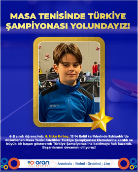 6-B sınıfı öğrencimiz H. Utku Kırbaç, 12-14 Eylül tarihlerinde Eskişehir’de düzenlenen Masa Tenisi Küçükler Türkiye Şampiyonası Elemelerine katıldı ve büyük bir başarı göstererek Türkiye Şampiyonası’na katılmaya hak kazandı.