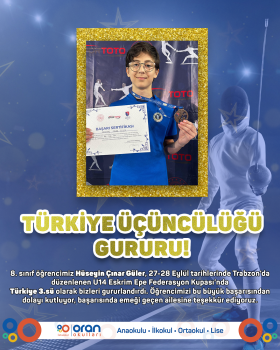 8. sınıf öğrencimiz Hüseyin Çınar Güler, 27-28 Eylül tarihlerinde Trabzon’da düzenlenen U14 Eskrim Epe Federasyon Kupası’nda Türkiye 3.sü olarak bizleri gururlandırdı. Öğrencimizi bu büyük başarısından dolayı kutluyor, başarısında emeği geçen ailesine teşekkür ediyoruz.