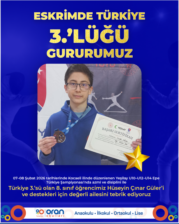 07-08 Şubat 2026 tarihlerinde Kocaeli ilinde düzenlenen Yeşilay U10-U12-U14 Epe Türkiye Şampiyonası’nda azmi ve disiplini ile Türkiye 3.’sü olan 8. sınıf öğrencimiz Hüseyin Çınar Güler’i ve destekleri için değerli ailesini tebrik ediyoruz.