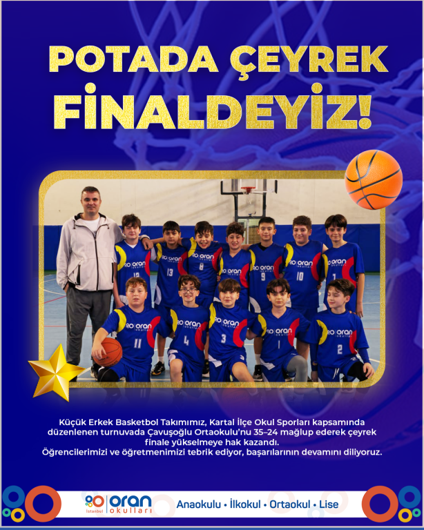 Küçük Erkek Basketbol Takımımız, Kartal İlçe Okul Sporları kapsamında düzenlenen turnuvada Çavuşoğlu Ortaokulu’nu 35–24 mağlup ederek çeyrek finale yükselmeye hak kazandı.