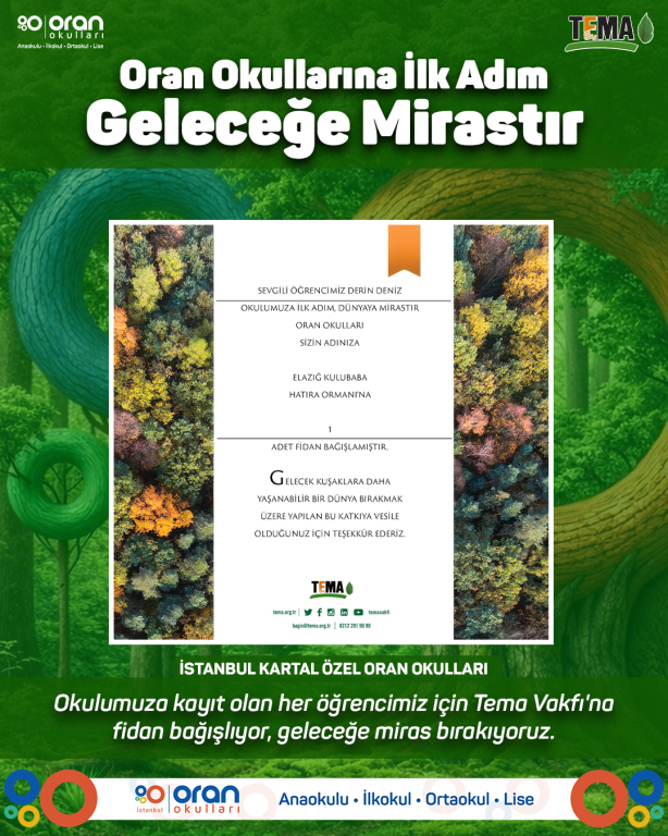 Okulumuza kayıt olan her öğrencimiz adına TEMA Vakfı’na fidan bağışlayarak, daha yeşil bir dünya için sorumluluk alıyoruz. Çünkü biliyoruz ki eğitim, doğaya saygıyla anlam kazanır.