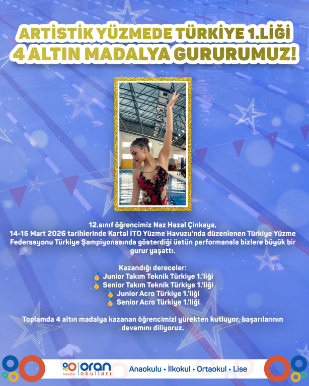 14-15 Mart 2026 tarihlerinde Kartal İTO Yüzme Havuzu’nda düzenlenen Türkiye Yüzme Federasyonu Türkiye Şampiyonasında gösterdiği üstün performansla bizlere büyük bir gurur yaşattı.
