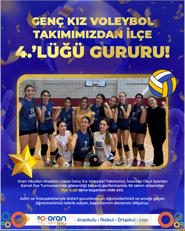 Oran Okulları Anadolu Lisesi Genç Kız Voleybol Takımımız, İstanbul Okul Sporları Kartal İlçe Turnuvası’nda gösterdiği başarılı performansla 36 takım arasından ilçe 4.sü olma başarısını elde etti.