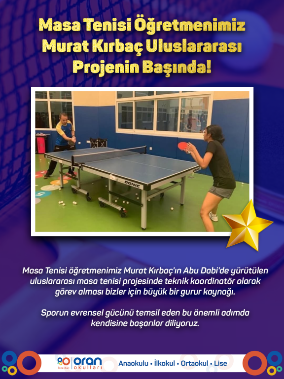 Masa Tenisi öğretmenimiz Murat Kırbaç’ın Abu Dabi’de yürütülen uluslararası masa tenisi projesinde teknik koordinatör olarak görev alması bizler için büyük bir gurur kaynağı.