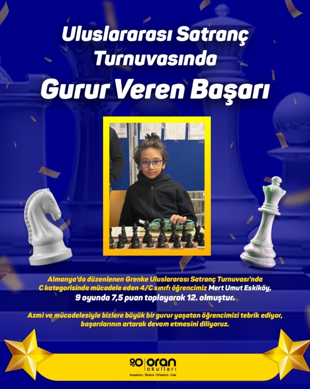 Almanya’da düzenlenen Grenke Uluslararası Satranç Turnuvası’nda C kategorisinde mücadele eden 4/C sınıfı öğrencimiz Mert Umut Eskiköy, 9 oyunda 7,5 puan toplayarak 12. olmuştur.